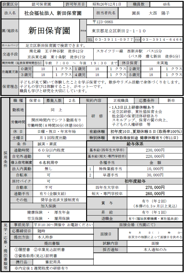 社会福祉法人新田保育園では、新年度に向けて以下の条件で募集しています。 ご連絡お待ちしております。